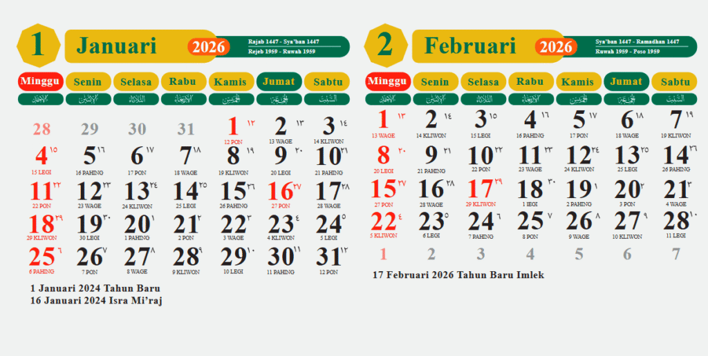 Kemenag menyediakan Kalender Hijriah Indonesia 2026 yang mengintegrasikan penanggalan Masehi, Hijriah, dan Jawa lengkap dengan hari pasaran (Legi, Pahing, Pon, Wage, Kliwon). Kalender ini sangat berguna bagi masyarakat yang mengikuti tradisi Jawa atau ingin mengetahui tanggal Hijriah untuk keperluan ibadah.